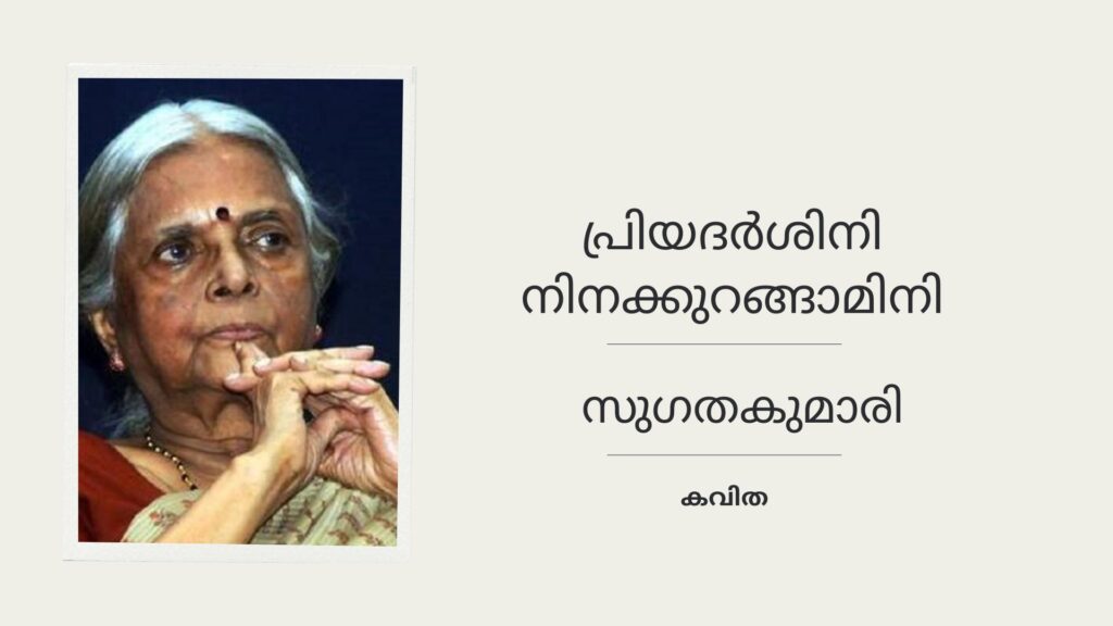 പ്രിയദർശിനി, നിന- ക്കുറങ്ങാമിനിശ്ശാന്തം… ഒരുനാളിലും സ്വൈര- മറിയാത്തൊരാത്തിര- ക്കൊഴിഞ്ഞൂ… കിടന്നമ്മ- യ്ക്കുറങ്ങാമിനി സ്വൈരം… ഇടിവെട്ടലിൻശേഷം കണ്ണുനീർ മഴപെയ്തു തിരയൊക്കെയും താണൂ….