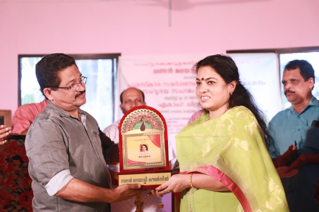 ലണ്ടൻ മലയാളി കൗൺസിൽ സാഹിത്യ പുരസ്കാരം ശ്രീമതി മിനി സുരേഷ്, ഫ്രാൻസിസ് ടി മാവേലിക്കരയിൽ നിന്ന് സ്വീകരിക്കുന്നു.