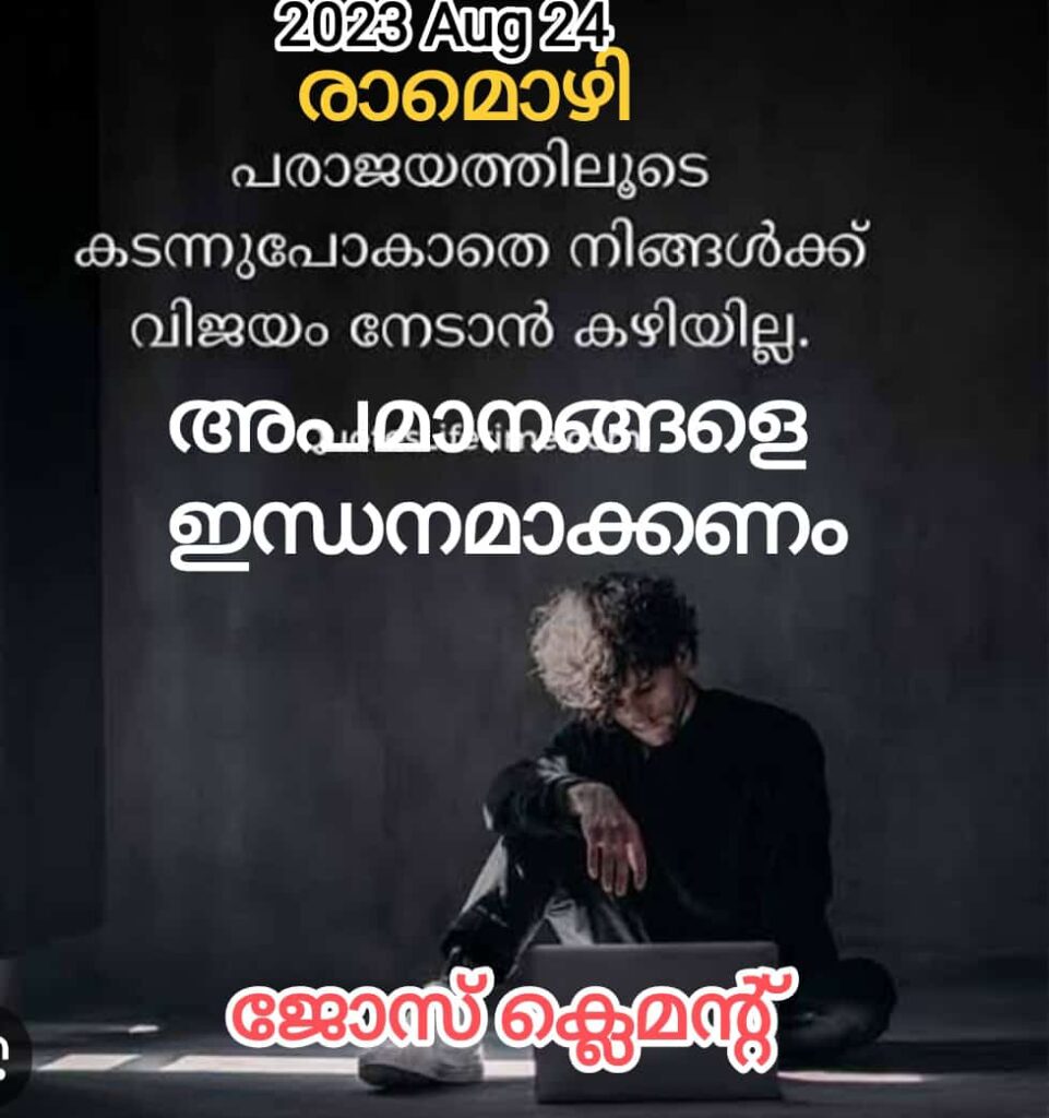 അപമാനങ്ങളും പ്രതിസന്ധികളും ജീവിതത്തിൽ സർവസാധാരണമാണ്. എന്നാൽ ചിലരിൽ ഇതിന്റെ ആഴവും പരപ്പും വലുതായിരിക്കും. അത് അവരെ നിരാശയിലേക്കും നിഷ്ക്രിയത്വത്തിലേക്കും നയിക്കും. അപ്പോൾ നാം ഡിസ്റേലിയുടെ വാക്കുകൾ ഓർക്കണം : ” കാർമേഘങ്ങളില്ലാത്ത ജീവിതത്തിൽ മഴവില്ല് വിരിയില്ല.” അപമാനങ്ങളെ , പരാജയങ്ങളെ വിജയത്തിലേക്കുള്ള ഇന്ധനമാക്കി മാറ്റാൻ നമുക്ക് കഴിയണം. തിരിച്ചടികൾ ജീവിതത്തിൽ തുടർച്ചയായി ഉണ്ടാകുമ്പോഴും മനം തളരാതെ എഴുന്നേൽക്കാനുള്ള കരുത്താർജിക്കണം. വിജയിക്കണമെങ്കിൽ വിജയിക്കാനുള്ള ആഗ്രഹം പരാജയ ഭീതിയേക്കാൾ ഉയർന്നു നിൽക്കുന്ന ഇന്ധനമായി നാം ജ്വലിക്കണം. ജോസ് ക്ലെമന്റ്