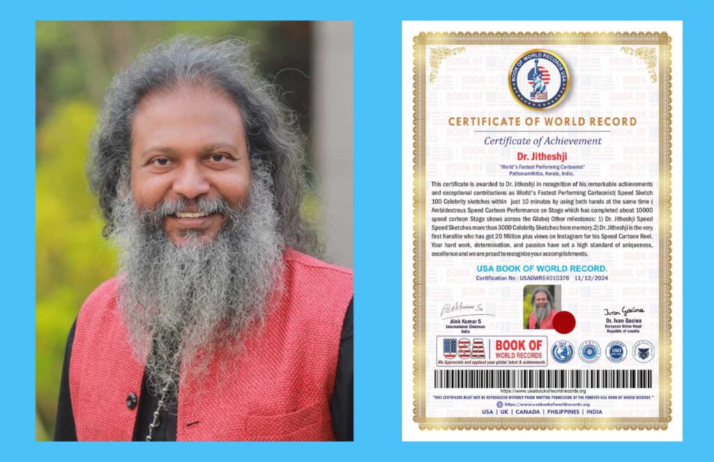 Pathanamthitta, Kerala : In an astonishing display of artistic prowess, Dr. Jitheshji, a renowned speed cartoonist and performing fine artist from Kerala, has set a new world record in speed drawing. The USA Book of World Records has officially recognized Dr. Jitheshji as the “World’s Fastest Performing Cartoonist” for sketching an incredible 100 celebrity Cartoon […]