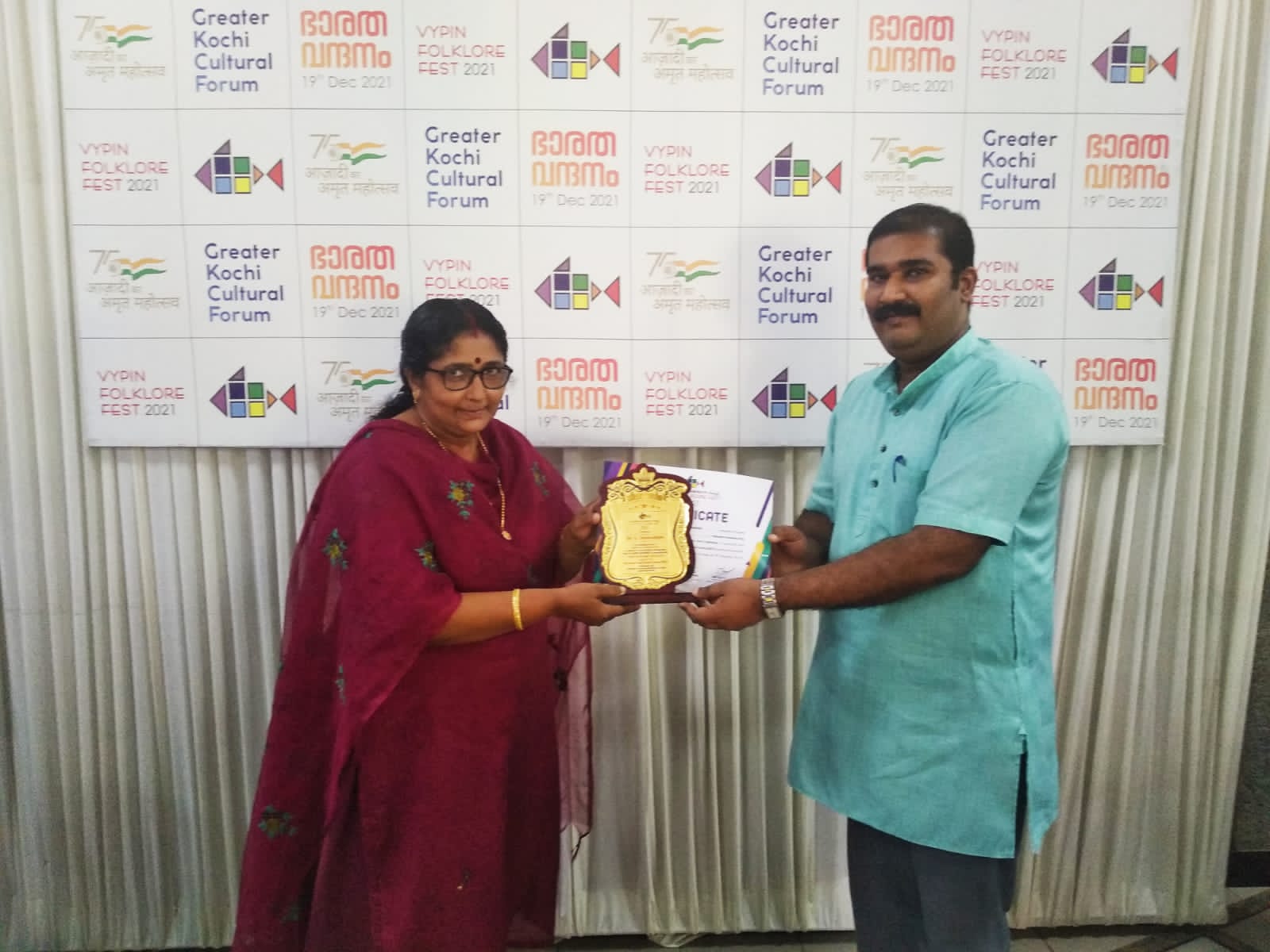 “ഭാരത വന്ദനം “പരിപാടിയിൽ ഫലകവും, പ്രശസ്തി പത്രവും ഏറ്റു വാങ്ങുന്നു. -ഡോ. എൽ. ശ്രീരഞ്ജിനി, മാന്നാർ.