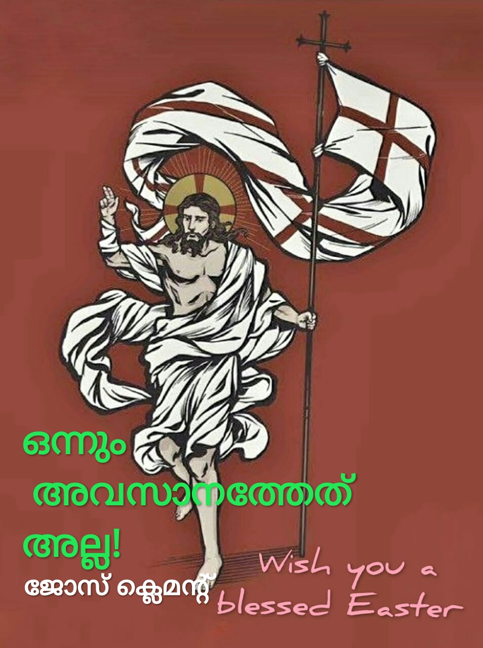 പേടിച്ചരണ്ട് മുറികളിൽ കയറി കതകടച്ചിരുന്ന ശിഷ്യഗണത്തിനു ജീവൻ വച്ചതും പ്രത്യാശ ലഭിച്ചതും ഉത്ഥിതന്റെ പ്രത്യക്ഷപ്പെടലുകളിലൂടെയായിരുന്നു. ഞങ്ങൾ അവനെ കണ്ടു എന്ന അവരുടെ ബോധ്യമാണ് ധീരരക്തസാക്ഷിത്വം വരിക്കാൻ പോലും അവരെ പ്രേരിപ്പിച്ചതും ശക്തിയേകിയതും. ഇത്തരമൊരു അനുഭവത്തിന്റെ ചൂടും ചൂരും ലഭിച്ചാൽ നമ്മുടെ ജീവിതത്തിലെയും പ്രതിസന്ധികൾ ഒന്നുമല്ലാതായിത്തീരും. എന്നാൽ മരണത്തെ തോല്പിച്ചവനെ അനുഭവിക്കാത്തവന് മേടമാസത്തിലെ ചൂടു പോലും ഏറെ അസ്വസ്തതയുളവാക്കുന്ന അനുഭവമാകുന്നു.പലതും നമ്മെ തളർത്തുന്നു. ജീവിത പ്രശ്നങ്ങളുണ്ടാകുമ്പോൾ ഒന്നും അവസാനിച്ചുവെന്ന് കരുതരുത്. ഒരു കിളി കൂടെ ചിലക്കാനും ഒരു പാട്ടു കൂടെ പാടാനും ഒരു വാതിൽ കൂടെ തുറക്കാനും ഒരു വാക്കു കൂടെ കേൾക്കാനും ഒരു കത്തുകൂടെ എഴുതാനും ഒരു സുഹൃത്തുകൂടെ വരാനുമുണ്ടെന്ന് ഓർക്കണം. ഒന്നും അവസാനത്തേതല്ല. അതേ, അവൻ ഉയിർപ്പിക്കപ്പെട്ടു. ഹല്ലേലൂയ ! പറഞ്ഞു തീരാത്ത വാക്കുകളിലൂടെ നേരുന്നു ; ഉയിർപ്പു തിരുനാളിന്റെ ആശംസകൾ ! ജോസ് ക്ലെമന്റ്