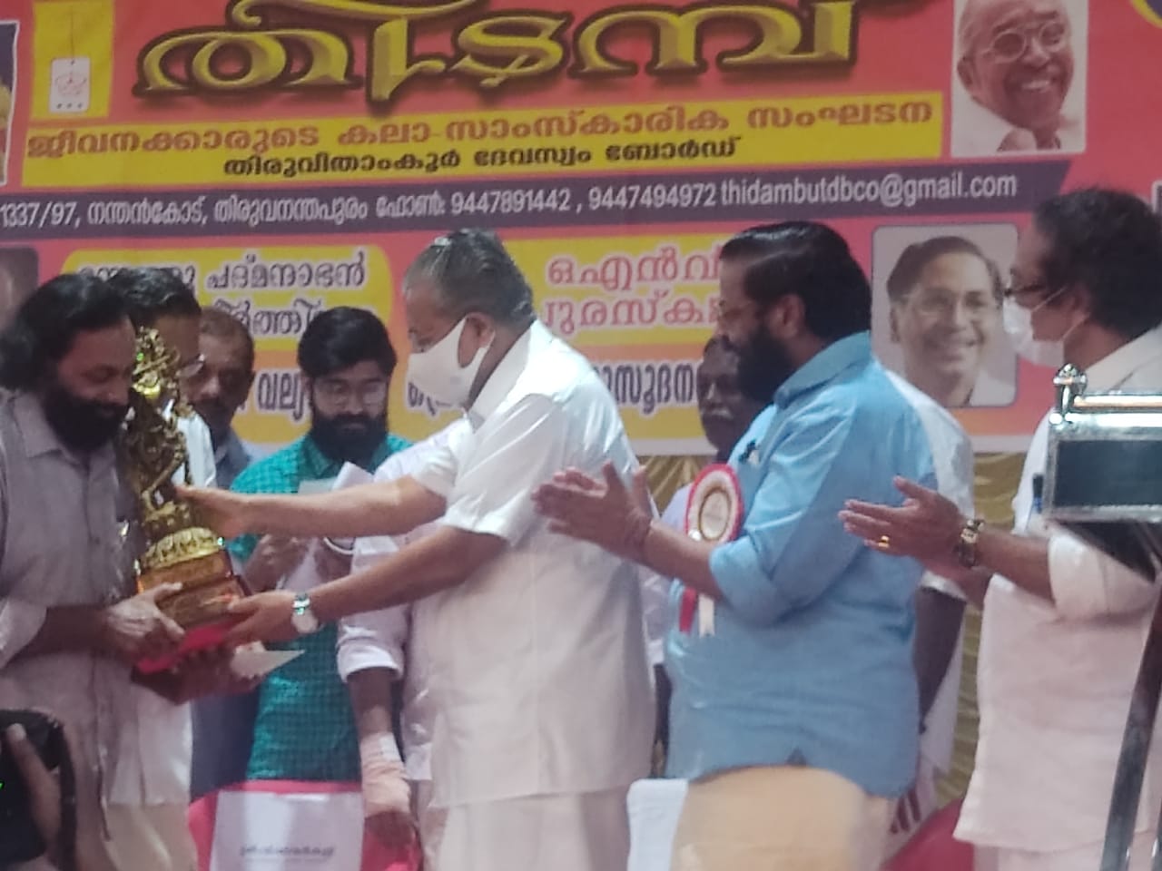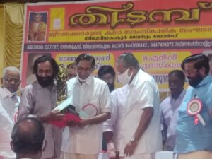 ആദരണീയനായ ഡോ. എം എസ്. വല്യത്താന് തിടമ്പിന്റ ആഭിമുഖ്യത്തിൽ സമർപ്പിക്കുന്ന മന്നത്തുപദ്മനാഭൻ സ്മാരകകീർത്തിമുദ്ര അദ്ദേഹത്തിന് വേണ്ടി ശ്രീ. നൂറനാട് രാമചന്ദ്രൻ കേരള മുഖ്യമന്ത്രി ശ്രീ. പിണറായി വിജയനിൽ നിന്നും ഏറ്റുവാങ്ങുന്നു.