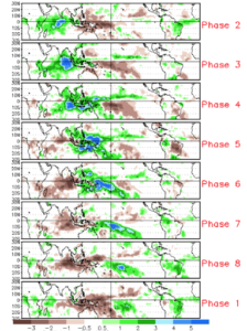ചിത്രം: 1979–2012 മുതൽ നവംബർ മുതൽ മാർച്ച് വരെയുള്ള എല്ലാ MJO ഇവന്റുകളുടെയും ശരാശരി (average) മഴയിൽ നിന്നുള്ള വ്യത്യാസം എട്ട് ഘട്ടങ്ങളിൽ. Green ഷേഡിംഗ് ശരാശരിക്ക് മുകളിലുള്ള മഴയെ സൂചിപ്പിക്കുന്നു, brown ഷേഡിംഗ് ശരാശരി മഴയെക്കാൾ താഴെയാണ് കാണിക്കുന്നത്. പച്ച ഷേഡിംഗ് ഏരിയകൾ MJO യുടെ സംവഹനം കൂടിയ ഘട്ടത്തിന്റെ വ്യാപ്തിയും brown ഷേഡിംഗ് MJO യുടെ സംവഹനം കുറഞ്ഞ ഘട്ടത്തിന്റെ വ്യാപ്തിയും കാണിക്കുന്നു.